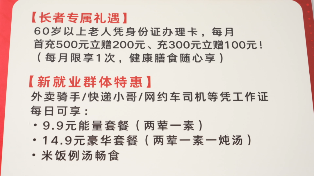 防浮泛全体做了从头拆修,勾当办还添置了新风系统,居平易近用餐时整个会比力干燥、比力透气。我们针对两个群体做了一些专属优惠,一个是针对60岁以上的供给一个500送200、 300送100的充值优惠。好比说像快递小哥、美团小哥和开滴滴的滴滴司机有特地推出了一个9块9和14块9的套餐。