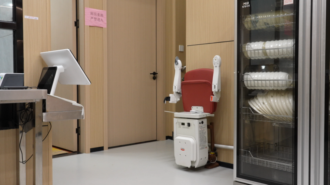这个无妨碍椅子,是社区预备的。正在我们食堂吃饭,白叟家有些走未便利的,能够用这个无妨碍椅子到二楼就餐。