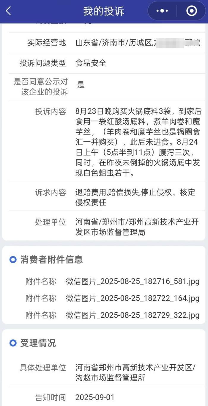 近日,一名消费者向红星旧事赞扬称,本人正在家附近的一家“锅圈食汇”店肆采办的暖锅底猜中吃出蛆虫。目前,她曾经向锅圈和市场监管部分赞扬,但锅圈方面提出的弥补100元的处理方案,本人无法接管。红星旧事记者从郑州市高新区市场监管局沟赵市场监管所获悉,目前已受理该赞扬,会对事务进行查询拜访。